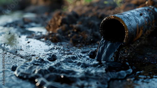 A polluting pipe releases dark liquid into the environment, highlighting a severe environmental degradation scenario.