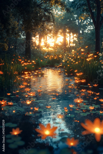 A pond filled with lots of water lilies in the middle of a forest