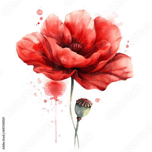 a poppy clipart, floral element, watercolor illustration, vivid red, isolated on white background transparent background
