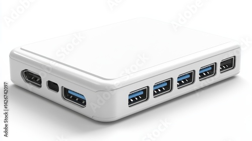 A portable charger with multiple USB ports isolated on a pure white background, realistic lighting and shadow, ideal for cut-out and compositing