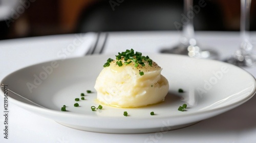 A portion of creamy mashed potatoes is artistically presented on a white plate, topped with fresh chives. This dish is part of a sophisticated meal in an upscale restaurant environment