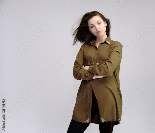 A portrait above the knee of a pretty adult brunette girl in a dress on a white background. Standing directly in front of the camera, showing different poses and emotions.