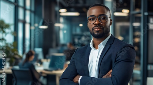 A portrait of a black businessman in a busy modern office, with a focused and determined expression.
