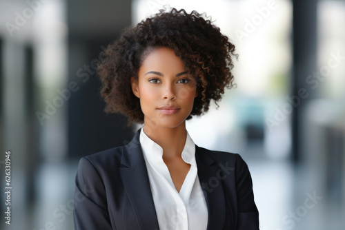 A portrait of a confident and proud African American woman symbolizing powerful corporate leadership. A representation of diversity and strength in the business world