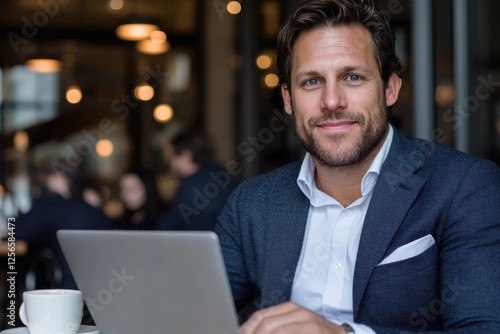 A portrait of a confident businessman working on a laptop in a stylish cafe, symbolizing professionalism, ambition, and the balance between work and leisure in urban life.