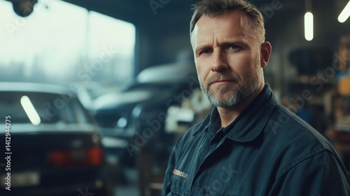 A portrait of a European man in his forties, dressed in mechanic attire, stands confidently in a garage filled with vehicles and tools.