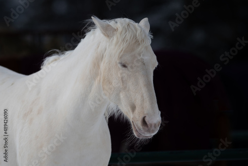 A portrait of a pure white horse head with pointy ears, a muscular body, pink skin, white hair, long white hair mane, and blue eyes. The domestic animal is in a coral with a green metal fence.