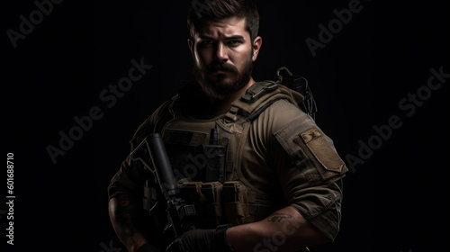 A portrait of a soldier, with beard, holding a rifle, proud, American, generative ai