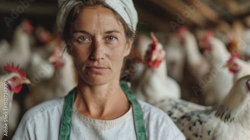 A portrait of a woman standing confidently among chickens, showcasing her role as a farmer, emphasizing connection to nature, agriculture, and sustainable farming practices.