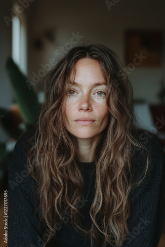 A portrait of a woman with flowing hair, seated in a cozy indoor environment, radiating natural beauty and authenticity, inviting connection and empathy through her gaze.