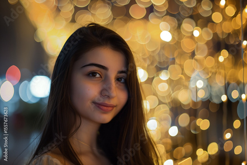 A portrait of a young woman with dark hair, warmly smiling. The background is filled with bokeh lights, primarily golden and yellow, lending a dreamy, festive air to the image.