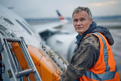 A portrait of an aircraft engineer standing on a maintenance ladder, inspecting the wing of a large aircraft, with the expansive airport runway stretching out behind them