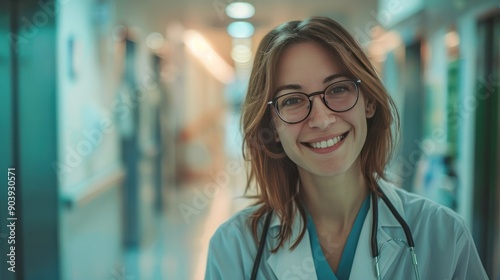 A portrait of an attractive female doctor smiling and wearing glasses standing in the hospital corridor