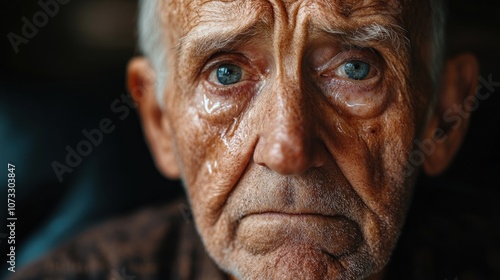 A portrait of an elderly man with wrinkles and sad eyes, tears streaming down his face, with natural light that helps to emphasize the details of his feelings.