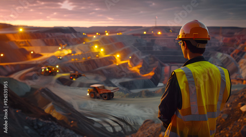 A portrait of an engineer in a high-visibility vest and hard hat, standing on the edge overlooking a mining site