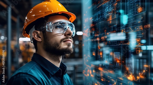 A portrait of an industrial engineer in a hard hat monitoring production flow in a factory.