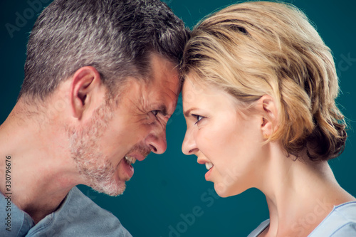 A portrait of angry couple staying face to face. People and emotions concept