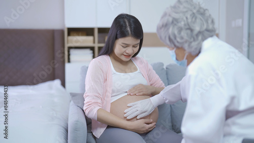 A portrait of happy Asian pregnant woman checkup with a doctor in bedroom at home. Having a baby. Family people lifestyle. Mom love.