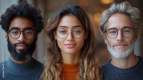 A portrait of three diverse individuals wearing glasses and looking at the camera with a neutral expression.