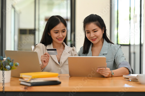 A portrait of two pretty Asian women sitting in the office looking at the tablet together and one woman holding a credit card, for finance and technology concept.