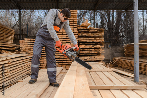 A portrait of young man carpenter at the wooden warehouse hold in his hands a chainsaw