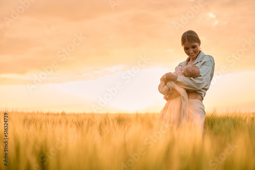 A portrait of young mother with a baby in her arms at sunset in the field. happy family concept