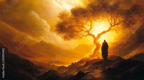 A portrayal of Moses standing before the burning bush, the divine light illuminating the scene creating a dramatic and powerful setting