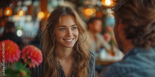 A positive and smiling young woman enjoys a romantic date outdoors, exuding happiness and confidence.