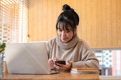 A positive Asian woman is checking messages on her smartphone while working on her laptop indoors.