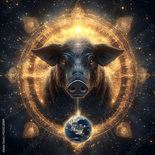 A powerful 3D rendering of Lord Varaha, the boar avatar, lifting Earth from the cosmic ocean, surrounded by glowing celestial symbols.
