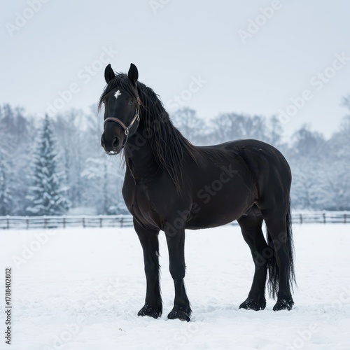 A powerful black Frisian horse stands majestically in a field covered by pristine white snow on a crisp, freezing winter morning, winter background, beauty, portrait