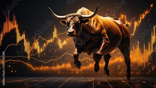 A powerful bull with large horns is depicted mid-leap against a backdrop featuring a glowing orange upward-trending line and abstract financial charts.