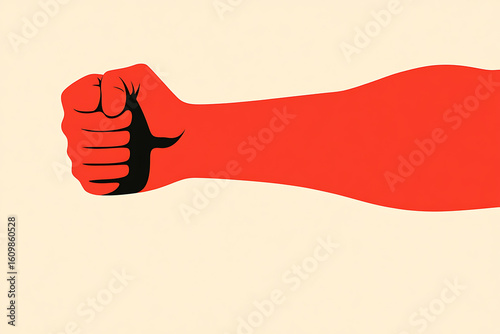 A powerful clenched fist in red and black, symbolizing strength, protest, or determination. Bold graphic illustration against a neutral backdrop.