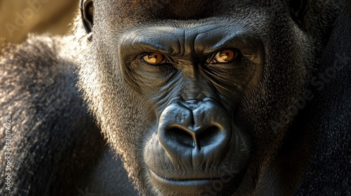 A powerful close-up of a gorilla, showing its strong, muscular face with an intense and thoughtful expression