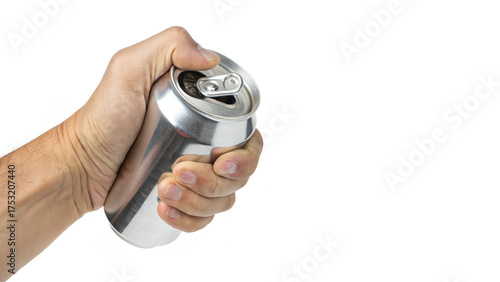 A powerful hand crushing and squeezing a silver aluminum beverage can for recycling isolated on transparent background