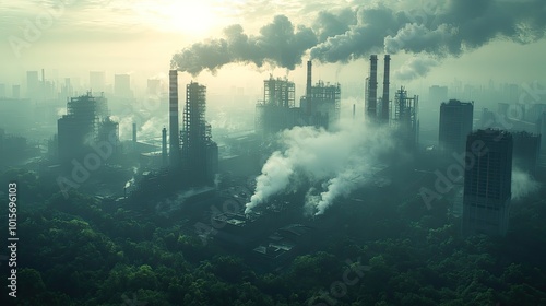 A powerful image of industrial smokestacks emitting pollution over a lush green forest, serving as an abstract background highlighting environmental issues.