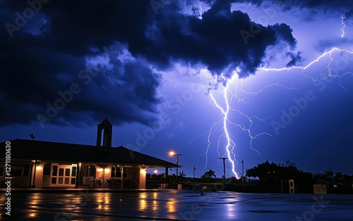 A powerful lightning strike hitting a building during a hurricane