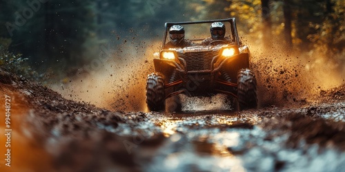 A powerful off-road vehicle charges through a muddy terrain, kicking up dirt and leaving a trail of spray in its wake