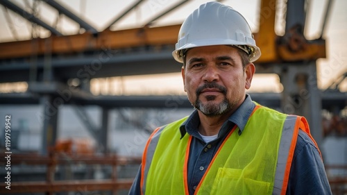 A powerful portrait of a construction worker on a bridge site, wearing a hard hat and reflective vest, steel beams and cranes in the background