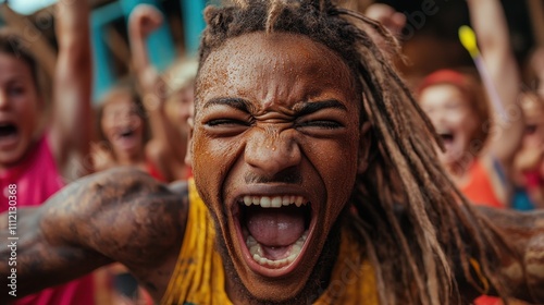 A powerful portrait of a young man shouting with joy and energy while surrounded by an excited crowd, encapsulating the essence of celebration and passionate expression.
