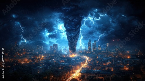 A powerful tornado tears through a city as lightning strikes.