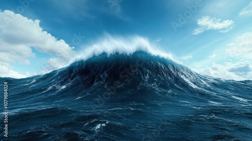 A powerful wave cresting under a bright sky with clouds.