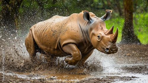 A powerful white rhino charges through muddy water, splashing and spraying.