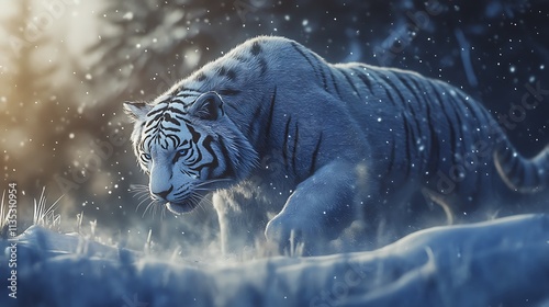 A powerful white tiger stalking silently in the snow with icy winds blowing around the trees