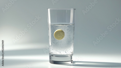 A precisely rounded yellow effervescent tablet of medicine slowly dissolving and creating a mesmerizing dance of fizzy bubbles in the crystal-clear water of glass isolated on white background