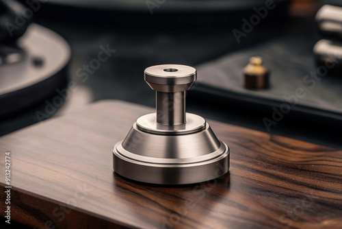 A precision machined metal tool rests on a polished wooden surface, surrounded by additional tools in a well-lit workshop environment