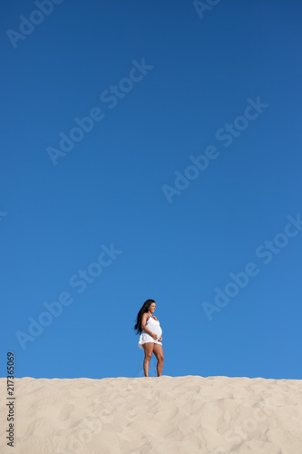A pregnant model on the beach in summer.