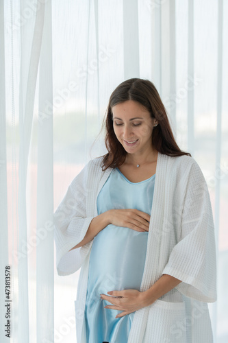 A pregnant woman in a bedroom with white curtains and early morning atmosphere