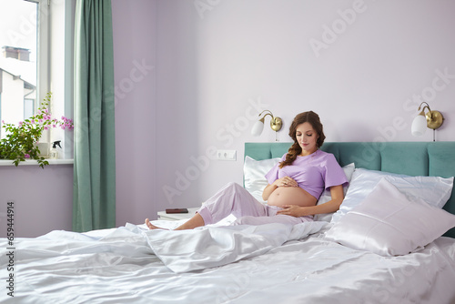 A pregnant woman sits in bed of her domestic bedroom and looking on her belly. Female enjoying her pregnancy state.