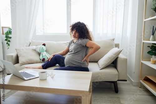 A pregnant woman sits on a sofa with a baby toy rabbit and watches a movie and video chat in a laptop. Lifestyle preparation for childbirth, last month of pregnancy